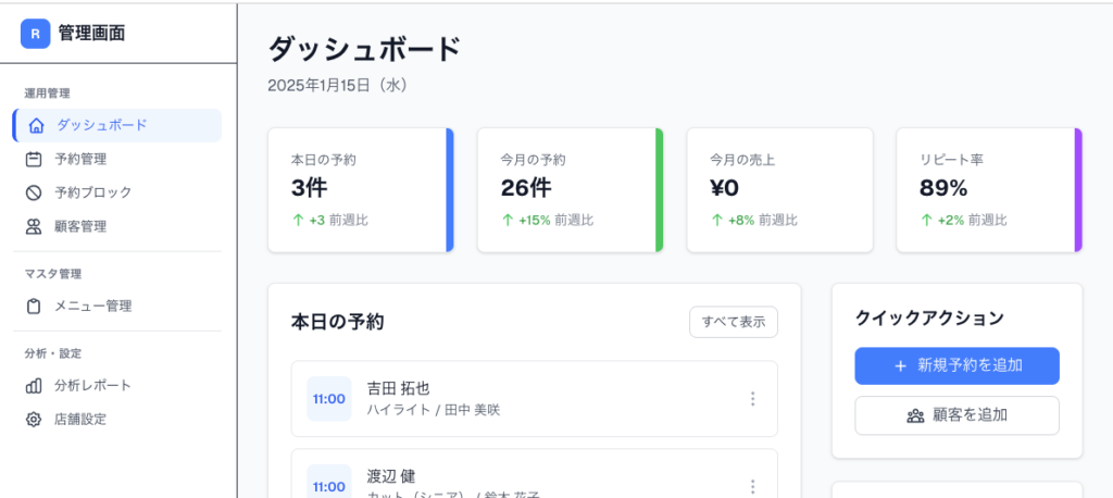 - 店舗管理者向け: ダッシュボード、予約カレンダー、顧客管理、スタッフ管理、メニュー管理、分析レポート