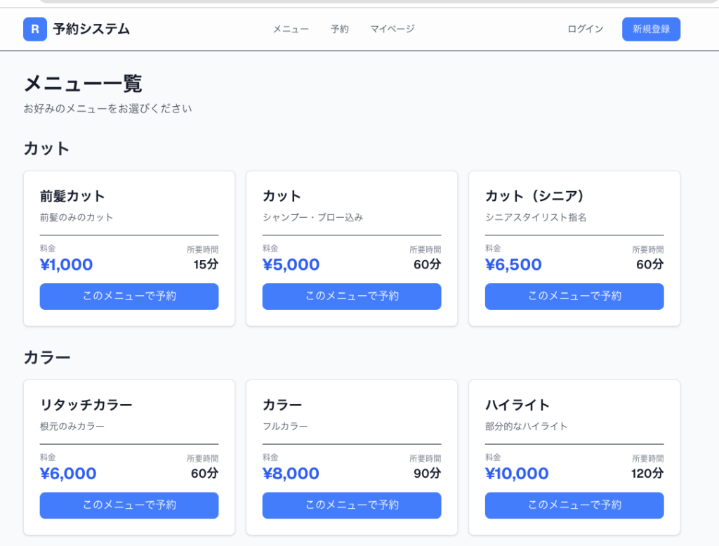 - 顧客向け: メニュー閲覧、空き状況確認、オンライン予約、予約変更・キャンセル、予約確認メール